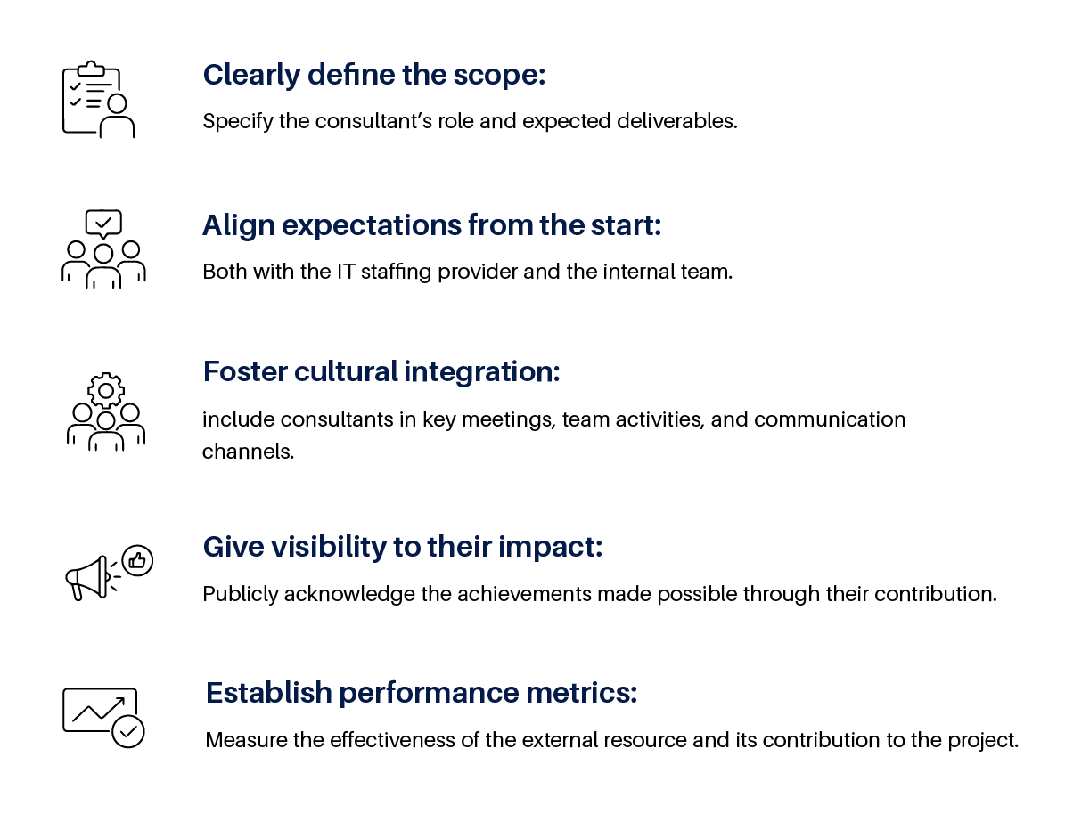 The implementation of Staffing IT must be evaluated with clear indicators. Some key metrics include: