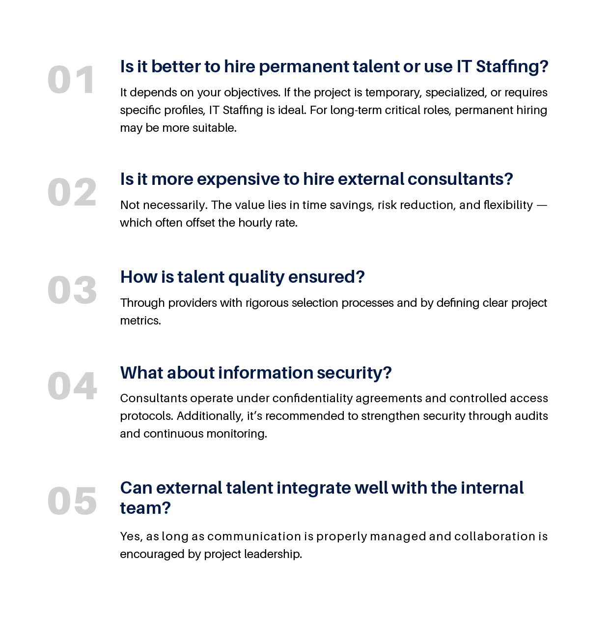 El IT Staffing consists of the incorporation of technology professionals under flexible schemes, either for projects, for hours or for specific periods. Unlike traditional hiring, it allows companies to have highly specialized profiles just when they need them, without having to bear the costs and risks of a permanent employment relationship.