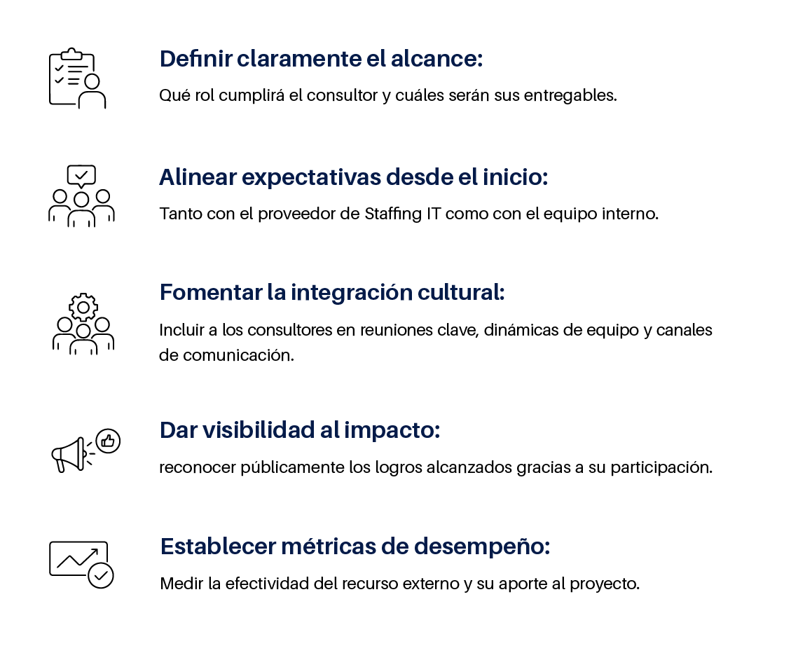 - Satisfacción del equipo: medir la percepción de los colaboradores respecto a la integración con consultores.