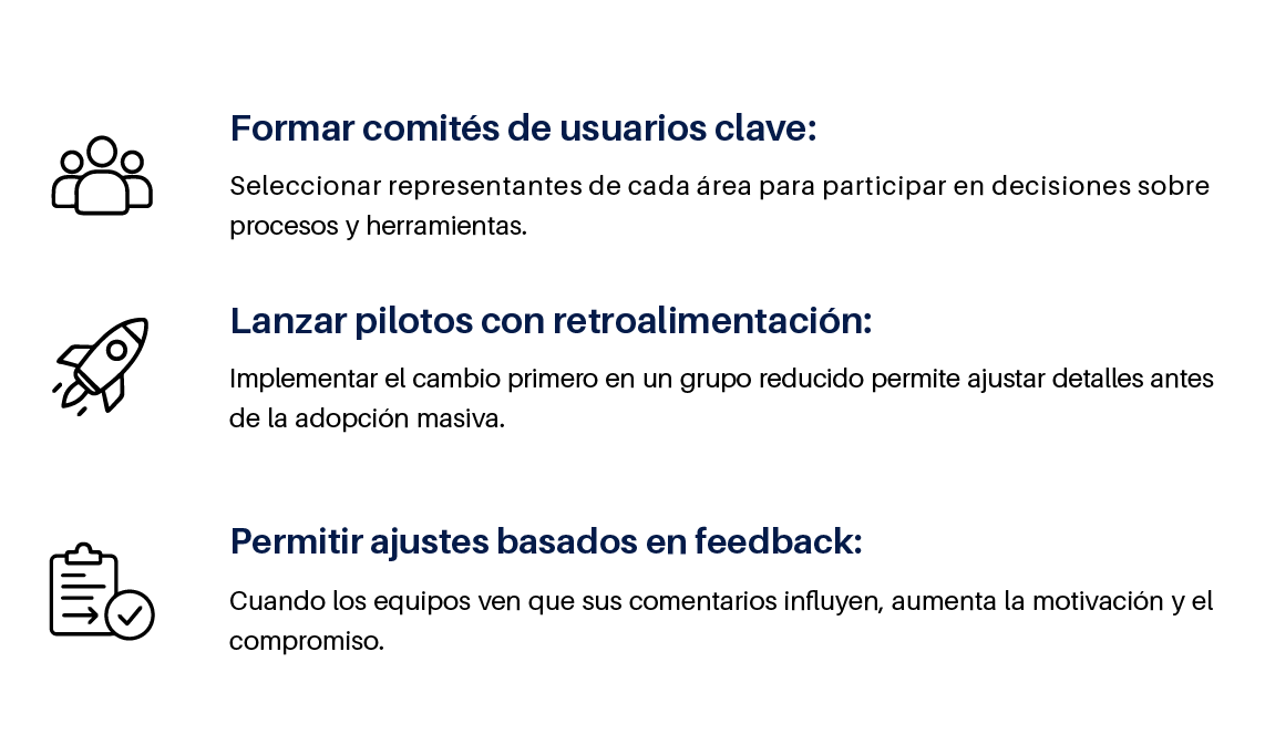 Involucrar a los colaboradores desde el inicio genera sentido de pertenencia y reduce la percepción de imposición.