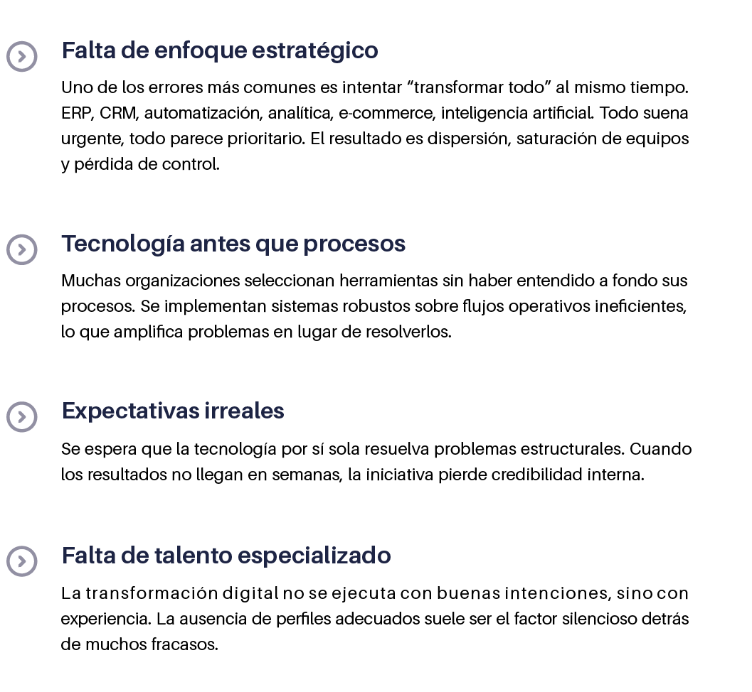 A pesar de contar con herramientas más avanzadas que nunca, muchas empresas siguen sin obtener los beneficios prometidos de la transformación digital. Las causas suelen repetirse independientemente del tamaño o industria.
